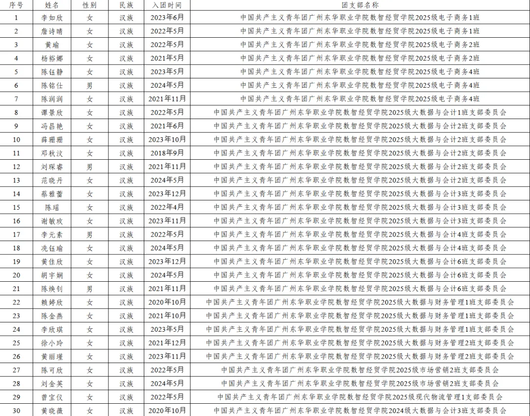 根据《中国共产党章程》《中国共产党发展党员工作细则》、共青团中央《共青团推优入党实施办法(试行)》(中青发〔2019〕9号)、《广州东华职业学院共青团推优入党工作实施办法》(广州东华党〔2022〕64号)和学校团委《关于做好2025-2026学年第一学期推优入党(入党积极分子)工作的通知》等相关规定,经个人申请、团支部推优大会推荐、数智经贸学院团委资格审查,詹诗晴等30名同学已具备推优入党条件,现予以公示。