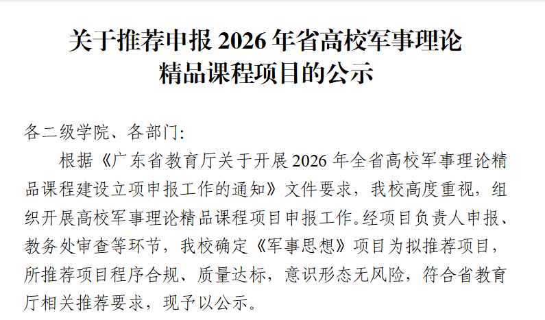 关于推荐申报2026年省高校军事理论精品课程项目的公示