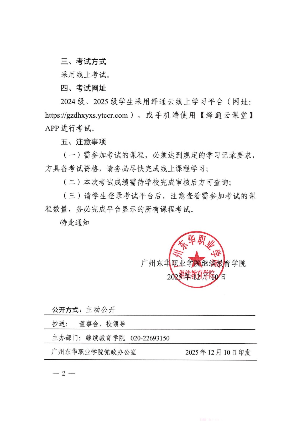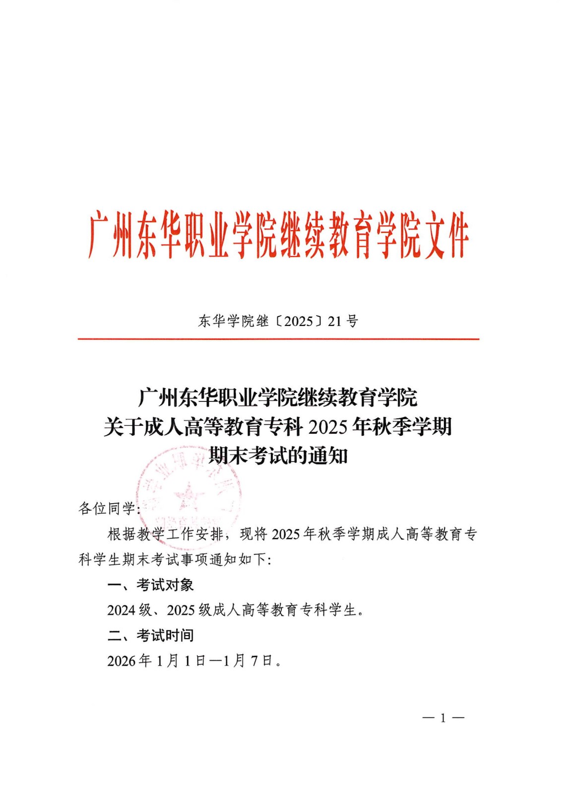 广州东华职业学院继续教育学院关于成人高等教育专科2025年秋季学期期末考试的通知