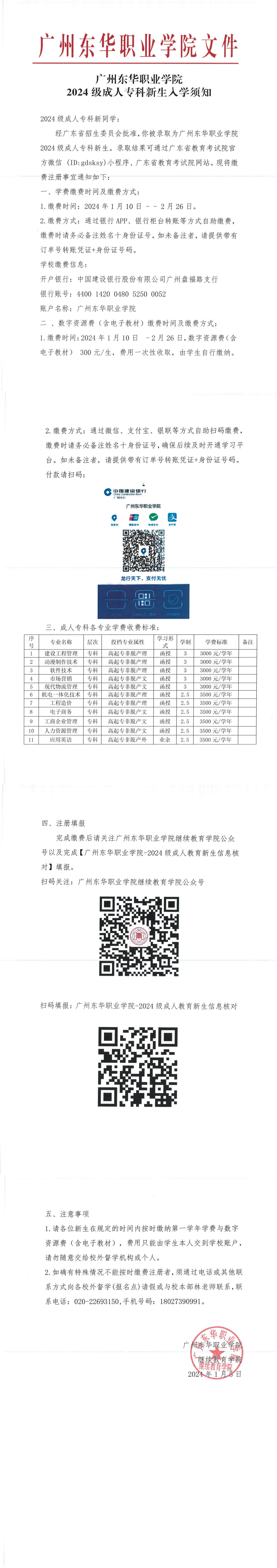 广州东华职业学院-2024级成人专科新生入学须知