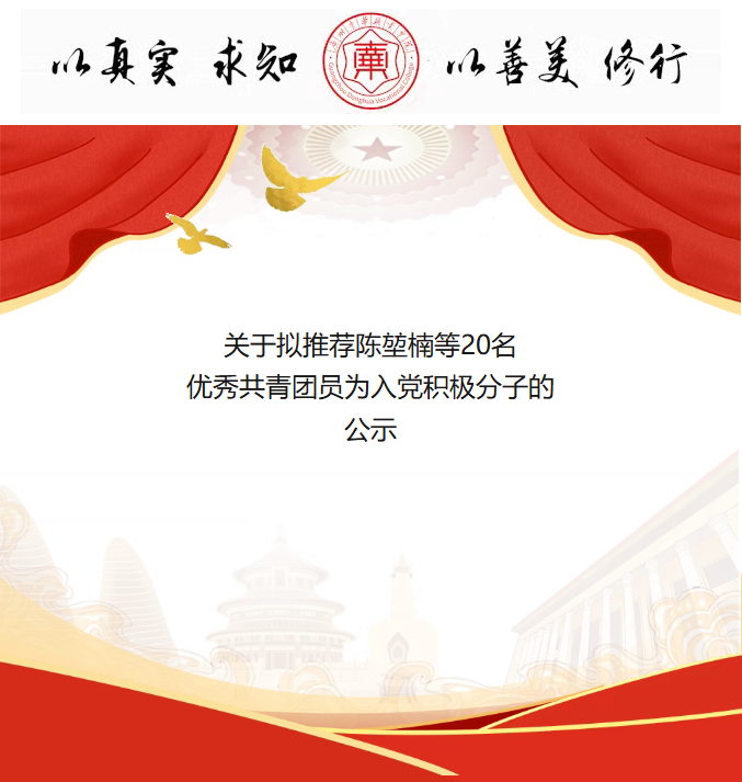 根据《中国共产党章程》《中国共产党发展党员工作细则》、共青团中央《共青团推优入党实施办法(试行)》(中青发〔2019〕9号)、《广州东华职业学院共青团推优入党工作实施办法》(广州东华党〔2022〕64号)和学校团委《关于做好2025-2026学年第一学期推优入党(入党积极分子)工作的通知》等相关规定,经个人申请、团支部推优大会推荐、人工智能学院学院团委资格审查,陈堃楠等20名同学已具备推优入党条件,现予以公示。现将其有关情况公示)