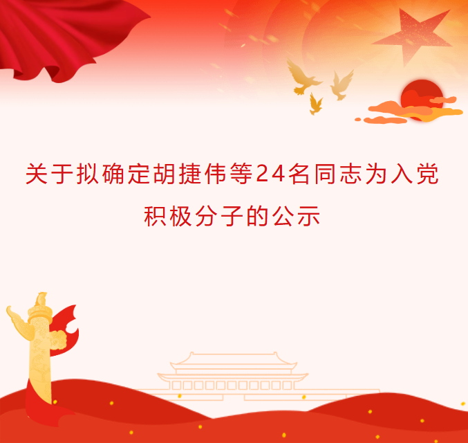 经党员推荐、群团组织推优,总支部委员会审查,拟将胡捷伟等24名同志确定为入党积极分子,根据发展党员工作有关要求,现将其有关情况公示(名单按班级MF积分排序)