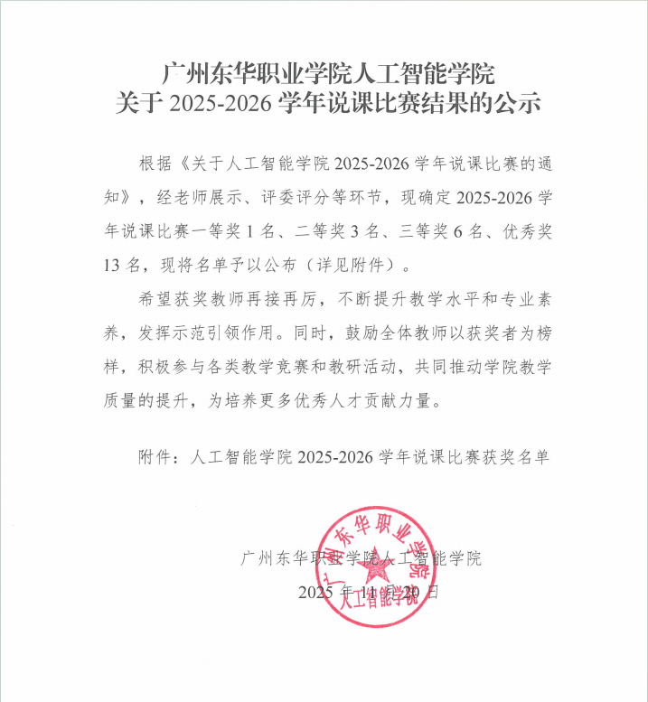 根据《关于人工智能学院2025-2026学年说课比赛的通知》,经老师展示、评委评分等环节,现确定2025-2026学年说课比赛一等奖1名、二等奖3名、三等奖6名、优秀奖13名,现将名单予以公布(详见附件)。