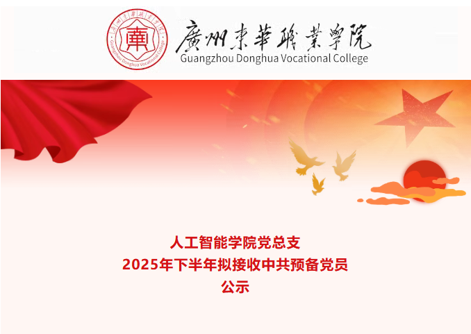 根据《中国共产党章程》《中国共产党发展党员工作细则》、共青团中央《共青团推优入党实施办法(试行)》(中青发〔2019〕9号)、《广州东华职业学院共青团推优入党工作实施办法》(广州东华党〔2022〕64号)和学校团委《关于做好2025-2026学年第一学期推优入党(入党积极分子)工作的通知》等相关规定,经个人申请、团支部推优大会推荐、人工智能学院学院团委资格审查,陈堃楠等20名同学已具备推优入党条件,现予以公示。现将其有关情况公示)