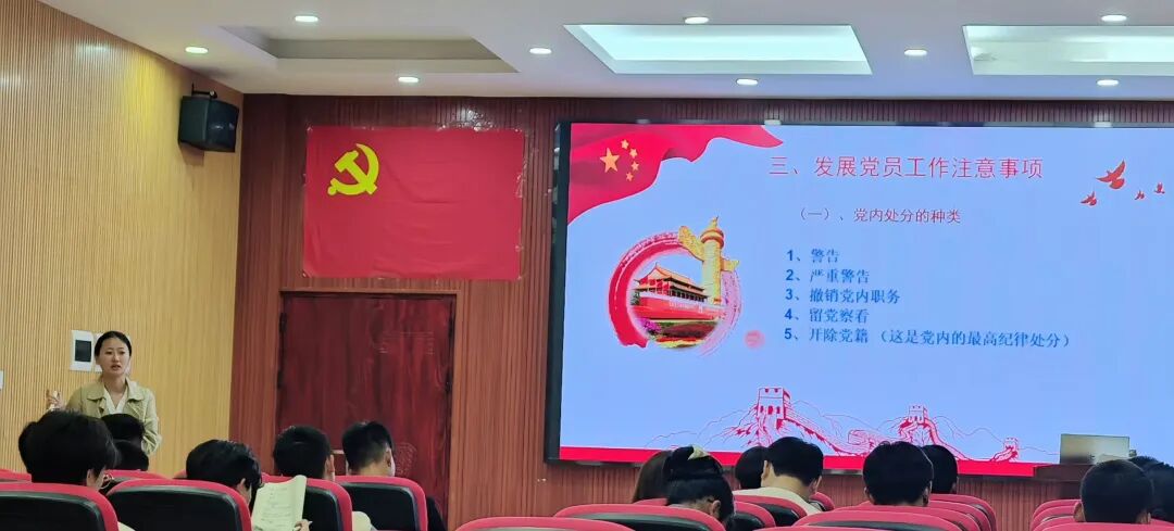 为了提升入党积极分子的综合素质,加强党的组织建设和推动党的事业发展。人工智能学院于11月12日晚,在15栋210教室成功举办了第25期入党积极分子培训课党课的第五讲,主题为《党员发展与党员教育管理》。本次党课由郑锦纯老师为大家授课。