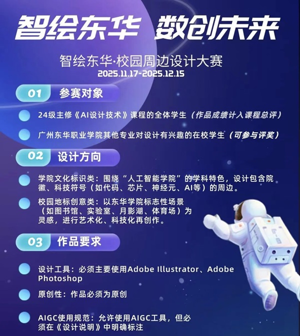 当AI技术碰撞校园情怀,当创意设计赋能青春表达,广州东华职业学院人工智能学院2025年“智绘东华·校园周边设计大赛”正式启幕!这场以赛代考、以赛促创的设计盛宴,邀你用灵感点亮校园,用技术勾勒未来~